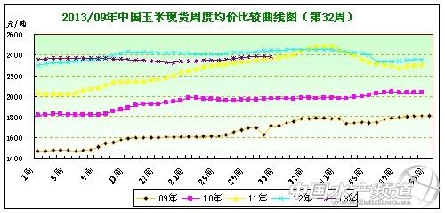 中國水產頻道報道,據上海益農訊,2013年第32周(8月5日-8月9日),玉米市場購銷進入尾聲,東北產地余糧見底、華北糧庫陸續放量,受成本支撐市場價格跌勢相對緩慢。益農監測第32周全國均價在2378.44元/噸,較31周下跌0.35%。 ![]()