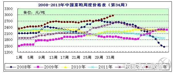 中國水產頻道報道,據上海益農訊, 一、市場概述 本周(2013年/8/16-8/23)。本周初菜粕期貨高位寬幅偏弱整理。同時受供應面偏緊,菜粕現貨價格再次上漲,目前國內菜粕生產企業的提價熱情在短時間內仍然難以被澆滅,加之國內外大豆、豆粕市場短時間內難以出現較大跌幅,因此預計國內菜粕現貨市場在短期內有望維持穩中略漲的局面,而期貨市場則在與現貨市場基本接近后,面臨震蕩運行。本周菜粕均價在2957元/噸左右,周度均價呈上漲趨勢。