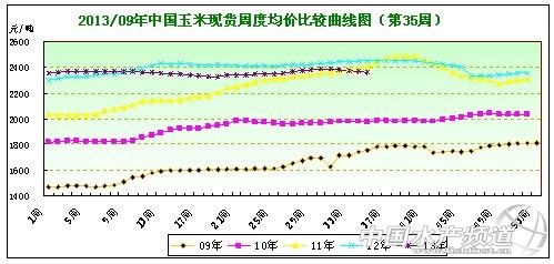 圖表:2013年第35周中國局部市場玉米現(xiàn)貨周度均價比較統(tǒng)計表(單位:元/噸)