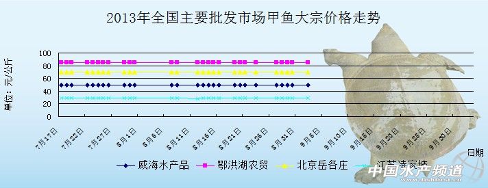 中國(guó)水產(chǎn)頻道獨(dú)家報(bào)道,9月2日全國(guó)主要批發(fā)市場(chǎng)甲魚價(jià)格行情如下: