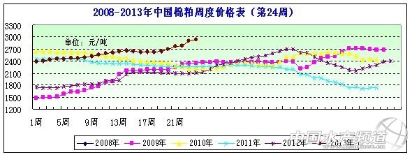 圖表:2013年6月2周(6月7日-6月14日,總第24周)中國主要地區(qū)棉粕價格統(tǒng)計(元/噸))