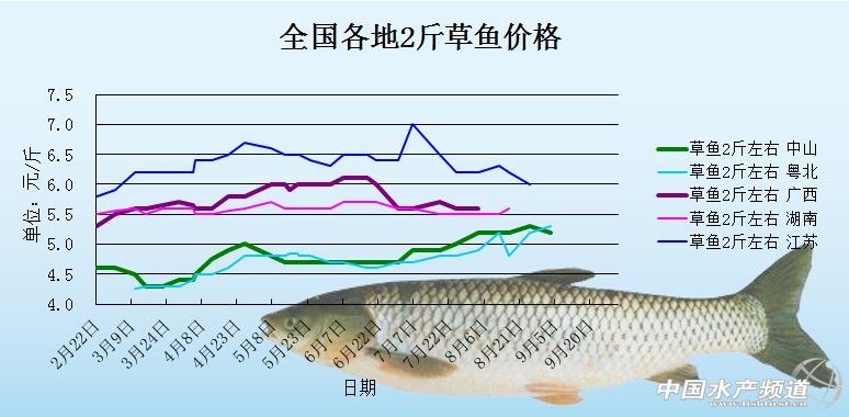 中國水產頻道獨家報道,據海大集團華南魚料部提供資料顯示,9月3日各地區2斤草魚價格情況如圖所示: 草魚價格 日期 地區 規格 價格 單位 9月3日 中山黃圃 1-3兩/尾 6.2 元/斤 9月3日 中山黃圃 2-5兩/尾 5.4 元/斤 9月3日 中山黃圃 3-7兩/尾 5.0 元/斤 9月3日 珠海斗門 1.5-2.5斤 5.2 元/斤 9月3日 番禺攬核 1.5-2.5斤 5.1 元/斤 9月3日 中山板芙 1.5-2.5斤 5.2 元/斤 9月3日 惠州潼湖 1.5-2.5斤 5.0 元/斤 9月3日 佛山順德 1.5-2.5斤 5.3 元/斤 9月3日 肇慶高要 1.5-2.5斤 5.3 元/斤 9月3日 廣東韶關 1.5-2.5斤 5.7 元/斤 9月3日 湖北武漢 2-4斤 5.4 元/斤 9月3日 湖南安鄉 2斤左右 5.3 元/斤 9月3日 廣西橫縣 3斤頭 5.6 元/斤 9月3日 廣西百色 3.5-4.5斤 5.8 元/斤 9月3日 中山板芙 5斤頭 6.5 元/斤 9月3日 佛山順德 5斤頭 5.3 元/斤 9月3日 廣東珠海 4斤起 5.6 元/斤 9月3日 廣東珠海 8斤起 7.3 元/斤 9月3日 廣東韶關 5斤上 6.5 元/斤 免責聲明: 1、凡本網注明“來源:水產前沿網”的所有作品,均為水產前沿網合法擁有版權或有權使用的作品,未經本網授權不得轉載、摘編或利用其它方式使用上述作品。已經本網授權使用作品的,應在授權范圍內使用,并注明“來源:水產前沿網”。違反上述聲明者,本網將追究其相關法律責任。 | |||||||||||||||||||||||||||||||||||||||||||||||||||||||||||||||||||||||||||||||||||||||||||||||||||||||||||||