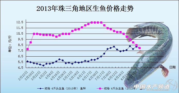 中國水產(chǎn)頻道獨(dú)家報道,據(jù)海大集團(tuán)華南魚料部提供消息,9月3日部分地區(qū)生魚價格情況如圖所示: 生魚 日期 地區(qū) 規(guī)格 價格 單位 9月3日 廣東順德 4斤頭 8 元/斤 8月30日 湖南益陽 2斤以上 8 元/斤 8月29日 廣東佛山 4-5斤標(biāo)頭 8.2-8.3 元/斤 8月25日 廣東順德 4斤頭 7.8 元/斤 8月23日 廣東順德 8 元/斤 8月22日 湖南益陽 2斤以上 8.4 元/斤 8月3日 佛山 4斤頭 8.2 元/斤 8月7日 佛山 3-5斤標(biāo)頭 7.7-7.9 元/斤 8月9日 湖南益陽 2斤以上 9 元/斤 8月9日 廣東順德 7.8 元/斤 8月12日 廣東順德 4斤頭 7.7 元/斤 8月14日 廣東佛山 4-5斤標(biāo)頭 7.3-7.4 元/斤 8月15日 湖南衡陽 2斤以上 9 元/斤 8月16日 廣東順德 7.5 元/斤 8月19日 順德杏壇 4斤頭 7.6 元/斤 8月21日 廣東佛山 4-5斤標(biāo)頭 8.3 元/斤 【關(guān)鍵字】:生魚 塘頭價 珠三角 中國水產(chǎn)頻道(www.fuqitext.com)獨(dú)家報道,轉(zhuǎn)載請說明出處,違者追究法律責(zé)任, 謝謝合作。 | ||||||||||||||||||||||||||||||||||||||||||||||||||||||||||||||||||||||||||||||||||||||||||