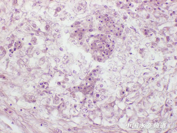 文/圖 廣州利洋水產科技有限公司 雷燕 戚瑞榮 中國水產頻道獨家報道,廣東省佛山市順德區勒流鎮一生魚(雜交鱧:斑鱧♀×烏鱧♂)養殖池塘,面積7.7畝,水深1.4米,3臺增氧機。2013年6月14日一次性放規格300尾/斤的生魚16.5萬尾,3-5尾/斤的鳙魚1500尾,12尾/斤的鯽魚6000尾。 圖1 病魚體表有出血點 圖片2 病魚肛門紅腫 圖片3 病魚鰓絲有出血點 7月15日,塘中出現生魚死亡,隨后死亡量逐日增加,同池塘的鯽魚和鳙魚未出現死亡。8月1日-3日,一直下雨,4日-6日晴天,6日死魚130尾,7日早上死亡260尾,早上10點到現場調查,測定水溫32℃,水質指標:pH值8.0,氨氮0.2mg/L,亞硝酸鹽0.2mg/L。從塘中取6尾頻死發病的生魚,外觀發病生魚體表有少量出血點(見圖1),肛門紅腫,解剖見鰓絲有出血(見圖2、3),肝臟和腎臟均有大量“白點”(見圖4、5),膽囊腫大,腸道空虛。分別從6尾魚的肝臟和腎臟中進行細菌分離培養,并取肝臟和腎臟用波恩氏固定液固定,切片進行組織病理變化觀察。 結果: 6尾發病魚的肝臟和腎臟中均分離出大量細菌,分離菌為革蘭氏陰性短桿菌,經16S rDNA測序鑒定為舒伯特氣單胞菌(Aeromonas schubertii),藥敏試驗結果顯示,該分離菌對“鰓膚康”、“多康素”、“鰓皮腸利康”、“腸苷康”、“出敗康”(商品名)等藥物敏感。組織切片觀察該病主要引起的病變是肝臟和腎臟中有大量壞死灶(見圖6)。 分析: 雜交鱧肝臟和腎臟等臟器上有“白點”樣病灶,一般有兩種原因,諾卡氏菌引起或舒伯特氣單胞菌引起,近年來在珠三角地區對多例該癥狀的雜交鱧進行細菌檢測,結果都是舒伯特氣單胞菌感染,未分離到諾卡氏菌,后者為革蘭氏陽性菌,二者選擇使用治療的藥物有很大的不同,通過本病例為大家正確診斷和選擇藥物提供依據。 【關鍵字】:氣單胞菌 雜交鱧 白點 |