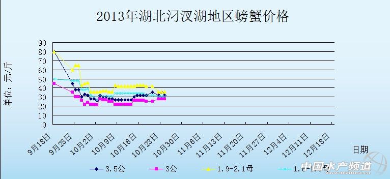 中國(guó)水產(chǎn)頻道獨(dú)家報(bào)道,據(jù)網(wǎng)友提供消息,10月24日湖北汈汊湖主產(chǎn)區(qū)河蟹價(jià)格行情如下: