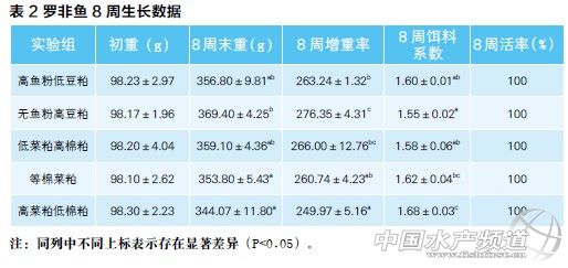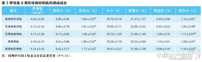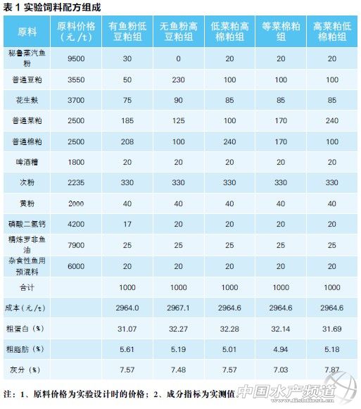 在配方成本不變的情況下,羅非魚飼料中菜粕過高會對魚生長造成影響,在一定添加范圍內(nèi),棉粕的效果要優(yōu)于菜粕,在無魚粉配方中豆粕為優(yōu)質(zhì)蛋白源。 文/圖 廣州市信豚水產(chǎn)技術有限公司 羅祖征 朱旺明 周萌 藍漢冰 韓正東 黃永政 朱志明 廣州信豚水產(chǎn)技術有限公司實驗基地 中國水產(chǎn)頻道獨家報道,本實驗設計了5組不同魚粉、豆粕、棉粕和菜粕比例的等價實用飼料,對奧尼羅非魚開展了兩個月的養(yǎng)殖實驗,結果表明無魚粉高豆粕組生長最快,且與低菜粕高棉粕組差異不顯著(P>0.05),但顯著高于其他各實驗組(P<0.05),高菜粕低棉粕組的增重率與等棉菜粕組無顯著差異,但顯著低于其他各實驗組(P<0.05);無魚粉高豆粕組飼料系數(shù)最低,顯著低于等棉菜粕組和高菜粕低棉粕組(P<0.05),與高魚粉低豆粕組、低菜粕高棉粕組無顯著差異(P>0.05),高菜粕低棉粕組的飼料系數(shù)最高。本實驗結果表明在配方成本不變的情況下,羅非魚飼料中菜粕過高會對魚生長造成影響,在一定添加范圍內(nèi),棉粕的效果要優(yōu)于菜粕,在無魚粉配方中豆粕為優(yōu)質(zhì)蛋白源。 一、材料和方法 1、試驗飼料和試驗魚 5組不同配方飼料按表1進行設計,并制成粒徑為3.0mm的膨化飼料。實驗用奧尼羅非魚購自佛山市南海區(qū)和順某水產(chǎn)養(yǎng)殖場,實驗時間為2012年6月4日-2012年8月4日,實驗地點為廣東省佛山市南海信豚中試基地。 2、實驗分組和投喂管理 實驗魚購回后在池塘暫養(yǎng)箱(2.5 m×2.5m×1.5m)中用普通市售羅非魚浮性飼料馴化2周至其完全適應池塘網(wǎng)箱環(huán)境。隨機選取1300條均重為99g的羅非魚分配到26個1.5m× 1.5m×1.5m(長×寬×深)的網(wǎng)箱中,每箱放50尾魚, 每組飼料3個重復。每天按初始體重的2.5%~6%分兩次投喂(09:00和16:00),根據(jù)水溫、天氣、魚的大小和攝食情況調(diào)整投喂量。試驗共進行8周,第4周時稱重一次,并根據(jù)體重調(diào)整投喂量。實驗期間池塘水質(zhì)采用水質(zhì)測試盒每周監(jiān)測一次(水溫每天監(jiān)測)。水質(zhì)條件為:水溫28-32℃,溶解氧>5.0mg/L,pH值7.2-7.6,總氨氮0.1-0.3 mg/L,亞硝酸鹽0.01-0.02 mg/L。 3、測定指標 養(yǎng)殖實驗結束前,停食24小時后測定每箱魚的總重,記錄飼料投喂量。實驗結束時,每組飼料取16條魚,測定體重、體長等相關指標,同時解剖觀察內(nèi)臟健康狀況,稱內(nèi)臟重、肝臟重,并取兩側背肌用于常規(guī)成分測定。增重率、飼料系數(shù)、成活率、肥滿度、臟體比和肝體比按以下公式計算: 增重率(%)=(末重+死魚重量-初重)×100 / 初重; 飼料系數(shù)(g/g)= 攝食量 /(末重+死魚重量-初重); 成活率(%)= 結束時尾數(shù)× 100 / 放入尾數(shù); 肥滿度(g/cm3)= 體重 × 100 / 體長3; 臟體比(%)= 內(nèi)臟重 × 100 / 體重; 肝體比(%)= 肝臟重 × 100 / 體重。 4、數(shù)據(jù)處理 實驗數(shù)據(jù)采用SPSS13.0統(tǒng)計軟件進行單因子方差分析(One-way ANOVA),同時進行Duncan氏多重比較,P<0.05為差異顯著。實驗數(shù)據(jù)以“平均值±標準差(Mean±SD)”表示。 二、結果與討論 1、實驗結果 經(jīng)過8周養(yǎng)殖實驗后,飼喂不同配方飼料的各實驗組的魚體增重率存在顯著差異(具體見表2),其中無魚粉高豆粕組的8周增重率與低菜粕高棉粕組差異不顯著(P>0.05),但顯著高于其他各實驗組(P<0.05),高菜粕低棉粕組的增重率與等棉菜粕組無顯著差異,但顯著低于其他各實驗組(P<0.05)。各實驗組的飼料系數(shù)以無魚粉高豆粕組最低,顯著低于等棉粕組和高菜粕低棉粕組(P<0.05),與高魚粉低豆粕組、低菜粕高棉粕組無顯著差異(P>0.05),高菜粕低棉粕組的飼料系數(shù)最高,與等棉菜粕組無顯著差異,但顯著高于其他各實驗組(P<0.05)。 從表3可以看出,各實驗組之間的肥滿度、臟體比之間沒有顯著差異。肝體比以低菜粕高棉粕組最低,顯著低于高菜粕低棉粕組(P<0.05),與其他各組間無顯著差異(P>0.05)。同時在本實驗中發(fā)現(xiàn)各組實驗飼料對實驗魚背肌的水分、粗蛋白、粗脂肪含量均沒有顯著影響(表3)。粗灰分以無魚粉高豆粕組最高,顯著高于高魚粉低豆粕組和等棉菜粕組(P<0.05),與其他組之間無顯著差異(P>0.05)。 2、討論 豆粕因其氨基酸平衡較好、消化吸收率高而作為羅非飼料的優(yōu)質(zhì)原料,可有效替代一定量魚粉的研究已有報道。趙海祥等(2011)研究發(fā)現(xiàn),以20%魚粉添加量為對照組,用不同豆粕添加量分別替代20-80%的魚粉,結果表明,在吉富羅非魚飼料中,可用豆粕替代80%的魚粉而對吉富羅非的生長不會造成顯著影響;大量研究表明,羅非魚對豆粕(干物質(zhì)、蛋白質(zhì)、氨基酸、能量)具有較高的消化吸收率(姜瑞麗等2010;吳建開等,2000;Sklan等,2004;Kenna等,2005)。在有關羅非魚對幾種植物蛋白消化率的研究中發(fā)現(xiàn),羅非魚對豆粕的干物質(zhì)、蛋白質(zhì)、能量的消化率要明顯高于菜粕和棉粕(吳建開等,2000;姜瑞麗等,2010)。在本實驗中,無魚粉高豆粕組飼料的豆粕用量遠遠高于高魚粉低豆粕組魚粉和豆粕的總含量,而菜粕、棉粕的含量則遠低于高魚粉低豆粕組。因此,從飼料蛋白源來看,無魚粉高豆粕組飼料的蛋白源組成要優(yōu)于高魚粉低豆粕組的蛋白源組成,這應該是無魚粉高豆粕組飼料的增重率顯著高于高魚粉低豆粕組,而飼料系數(shù)則顯著低于無魚粉高豆粕組的主要原因。 在本實