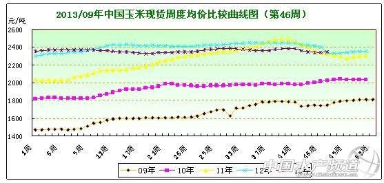 中國(guó)水產(chǎn)頻道報(bào)道,據(jù)上海益農(nóng)訊,2013年第46周(11月11日-11月15日),國(guó)內(nèi)農(nóng)戶惜售心理增強(qiáng),新玉米上市放緩,但需求面仍表現(xiàn)不佳,壓制本周玉米現(xiàn)貨價(jià)格反彈空間。益農(nóng)監(jiān)測(cè)第46周全國(guó)均價(jià)在2345.78 元/噸,較45周上漲0.17%。 圖表:2013年第46周中國(guó)局部市場(chǎng)玉米現(xiàn)貨周度均價(jià)比較統(tǒng)計(jì)表(單位:元/噸)