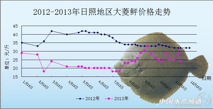 中國水產頻道獨家報道,據青島七好生物科技有限公司提供資料顯示,2013年11月27日,山東日照地區大菱鲆塘頭報價為24元/斤。