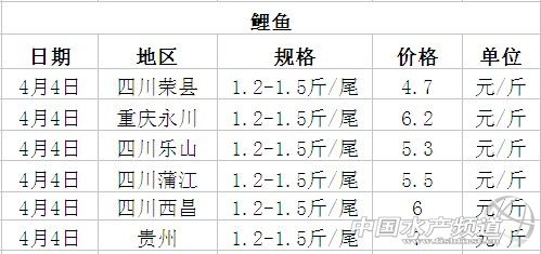 中國水產頻道獨家報道,據海大集團成都海大提供消息,4月4日各地鯉魚價格行情如下: