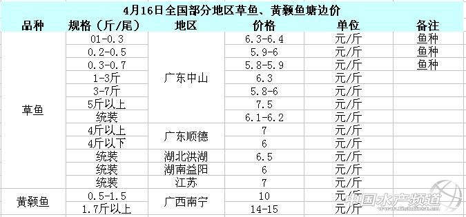 2014年4月16日全國部分地區草魚黃顙魚塘邊價