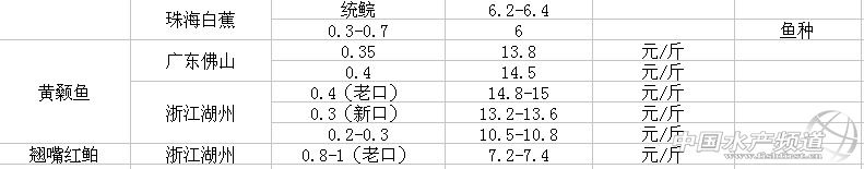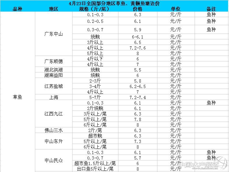中國水產頻道獨家報道,據悉,本周各地草魚行情良好,各地的草魚價格跟上周相比出現了不同的漲幅。廣東中山地區0.2-0.5斤/尾規格的魚種價格相比上周上漲0.1-0.2元/斤,5斤以上/尾規格的草魚價格上漲0.5元/斤,其它規格的魚種和草魚價格則不變。湖北洪湖地區的草魚價格相比上周下降1元/斤。廣東順德地區、湖南益陽地區、江蘇鹽城地區和上海地區的草魚價格跟上周持平,價格穩定無波動。浙江湖州地區(老口)0.4斤/尾規格的黃顙魚價格相比上周上漲0.8-1元/斤,(新口)0.3斤/尾規格的黃顙魚價格相比上周則上周0.4-0.8元/斤。廣東佛山地區的黃顙魚價格跟上周基本持平,價格也相對穩定。浙江湖州地區的翹嘴紅鲌價格相比上周下降0.6-0.8元/斤。具體價格如下: 中國水產頻道獨家報道,轉載請注明出處www.fuqitext.com! |