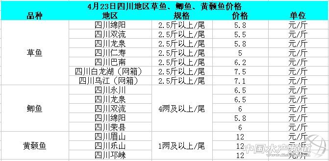 中國水產頻道獨家報道,據海大集團成都海大提供消息,4月23日四川綿陽地區的草魚價格相比上周上漲0.1元/斤,四川龍泉地區的草魚價格相比上周上漲0.2元/斤,四川烏江地區的價格相比上周上漲0.1元/斤,其它地區草魚價格不變。四川龍泉地區的鯽魚價格相比上周上漲0.4元/斤,其它地區鯽魚價格則不變。四川地區的黃顙魚價格與上周持平。具體價格行情如下: