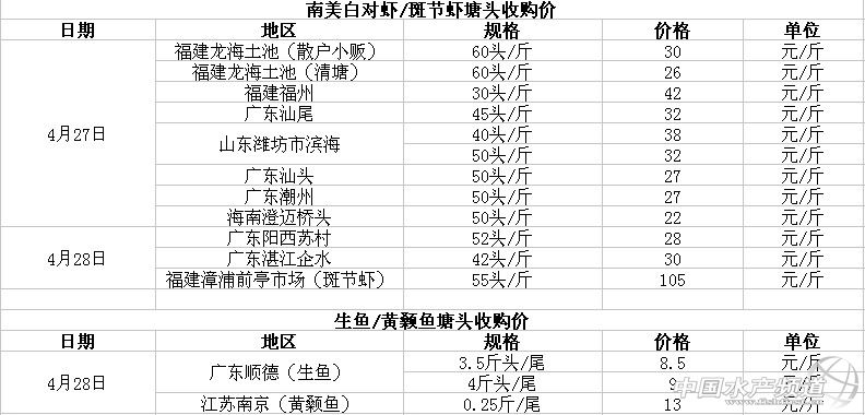 中國水產頻道獨家報道,據恒興養殖服務提供消息,4月28日全國部分地區南美白對蝦和生魚塘頭收購價行情如下:
