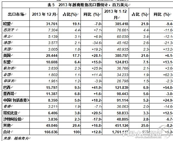 生產(chǎn)情況 中國水產(chǎn)頻道獨家報道,2013年越南水產(chǎn)品產(chǎn)量預(yù)估達605萬噸,同比增長2.1%。其中,捕撈水產(chǎn)品271萬噸,同比增長2.2%;養(yǎng)殖水產(chǎn)品334萬噸,同比增長2%。在養(yǎng)殖水產(chǎn)品中,蝦類為54.8萬噸,同比增長12.3%,鯰魚(亦稱巴沙)為115萬噸,同比下降7.6%。 出口情況 根據(jù)越南海關(guān)數(shù)據(jù),2013年越南水產(chǎn)品出口額超過67億美元,同比增長9.6%。其中蝦類出口額超過30億美元,同比增長39%,鯰魚出口額為17.6億美元,同比增長1%,金槍魚出口額下降至5.27億美元,同比降幅為7.2%,頭足類為4.48億美元,同比下降11%。 越南水產(chǎn)品出口額增長主要與越南蝦類出口額大增有關(guān),2013年越南蝦類出口額占水產(chǎn)品出口總額的46%,其中白對蝦的出口額增幅高達113%,接近16億美元,斑節(jié)對蝦的出口額增幅僅6.2%,達13億美元。 2013年,美國取代歐盟成為越南水產(chǎn)品第一大出口市場,對美出口額達15億美元,同比增長27%,占越南水產(chǎn)品出口總額的22.6%。歐盟成為越南第二大水產(chǎn)品出口市場,這主要與越南蝦類輸歐開始復(fù)蘇有關(guān),對歐盟出口額實現(xiàn)11.8億美元,同比增長4%。 對日本的出口額略有增長,增幅為5%,達11.5億美元。除對墨西哥市場出口額下降2%之外,對其他市場的出口額基本穩(wěn)定或保持小幅增長。 圖1 2013年越南主要出口水產(chǎn)品占比 蝦類出口額大幅上揚。有消息稱,日本當局曾經(jīng)考慮將原產(chǎn)于越南的蝦產(chǎn)品乙氧喹最大殘留限量由0.01ppm提高至0.2 ppm,最終的決定結(jié)果有可能在2014年1月底宣布。在2012年,越南蝦產(chǎn)品輸日曾因日本乙氧喹殘留問題檢查受阻,依據(jù)規(guī)定,不符合要求的蝦產(chǎn)品必須退回,導(dǎo)致成本增高。近兩年來,越南主管當局和蝦企努力解決乙氧喹的殘留問題,越南蝦重新獲得了出口日本的機會。截止到2013年10月,越南蝦對日出口同比增長13%,達5.745億美元。2013年全年對日出口額達7.09億美元,同比增長14.7%。而且,對美國、歐盟、中國、韓國、加拿大、澳大利亞、東盟等市場的出口也在猛增。在湄公河三角洲,2013年底斑節(jié)對蝦收購價在VND240,000-280,000/千克,白對蝦的收購價在VND140,000-190,000/千克,在高價格和高產(chǎn)量的推動下,有的養(yǎng)殖業(yè)者獲得了10億VND/公頃的高收益。 鯰魚出口額增長停滯。與蝦類出口不一樣,越南鯰魚出口在原料魚供應(yīng)短缺導(dǎo)致原料魚價格不穩(wěn)定中復(fù)蘇緩慢,對歐盟的一些傳統(tǒng)市場出口持續(xù)下降。2013年底在湄公河三角洲的鯰魚原料價格為22,000 – 22,500越南盾/千克,比生產(chǎn)成本低VND1,500 – 2,000/千克。 展望 2014年,越南政府決定削減農(nóng)業(yè)、林業(yè)及水產(chǎn)品增值稅,幫助生產(chǎn)商和出口商應(yīng)對低靡的市場需求,緩解企業(yè)經(jīng)濟壓力。預(yù)計越南水產(chǎn)品對中國大陸和香港地區(qū)的出口或?qū)⑿纬尚碌臐撛谑袌觥M瑫r,越南還正在比利時澤布魯日港新建一個“輸歐鯰魚產(chǎn)品配送中心”,這無疑也將幫助越南進一步擴大其輸歐鯰魚產(chǎn)品的銷售覆蓋面。 在全球經(jīng)濟緩慢復(fù)蘇帶動下,水產(chǎn)品需求有望小幅增長,2014年越南蝦類出口有望超過30億美元達35億美元,鯰魚、金槍魚、頭足類和其他海水產(chǎn)品出口均有可能復(fù)蘇。越南水產(chǎn)品加工與出口協(xié)會透露,蝦類仍被確定為越南水產(chǎn)品出口中的主力軍。預(yù)計,2014年越南斑節(jié)對蝦養(yǎng)殖面積為59萬公頃,養(yǎng)殖產(chǎn)量達27萬噸;白對蝦養(yǎng)殖面積將為8萬公頃,養(yǎng)殖產(chǎn)量達29萬噸。在蝦苗質(zhì)量穩(wěn)定,且養(yǎng)殖產(chǎn)品的化學(xué)物質(zhì)和抗生素殘留也能有效控制前提下,2014年越南水產(chǎn)品出口額有望超越2013年,增至70億美元。 【關(guān)鍵字】:越南水產(chǎn)品 水產(chǎn)品出口 水產(chǎn)養(yǎng)殖網(wǎng) 中國水產(chǎn)頻道獨家報道,轉(zhuǎn)載請說明出處《水產(chǎn)前沿》雜志 www.fuqitext.com ,違者追究法律責(zé)任, 謝謝合作。 |
