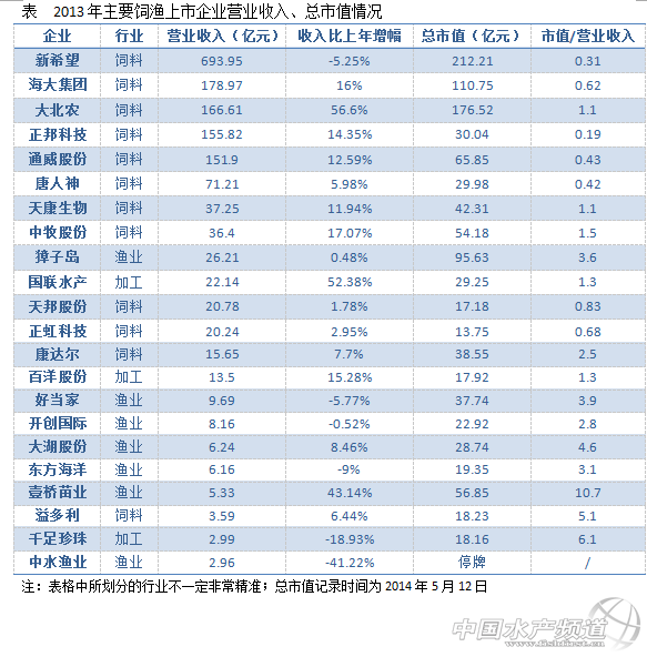 中國水產頻道獨家報道, 截至4月30日,22家主要飼漁上市企業2013年年度報告全部發布,其中主業同飼料相關的上市企業12家,漁業類上市企業7家,加工類上市企業3家(所劃分行業不一定非常精準,僅是編者個人觀點)。本文對各企業2013年的營業收入情況、總市值情況做了記錄和簡要分析。 由表看出,目前企業規模較大的為飼料企業,這也符合飼料行業追求規模效益的特點。2013年營業收入超過100億元的企業有5家,都為飼料企業,新希望以693.95億元居于榜首;5月12日記錄的企業總市值中,100億元級以上的企業有3家,都為飼料企業,新希望以212.21億元居于榜首。獐子島目前總市值為95.63億元,是最有可能突破100億元的漁業類上市企業。 2013年表現最好的企業為大北農,營業收入比上年增幅達56.6%;其次為國聯水產,增幅達52.38%;再者為壹橋苗業,增幅為43.14%。表現最差的企業為中水漁業,跌幅為-41.22%。 飼料類上市企業中,新希望是唯一收入下滑的企業;除了壹橋苗業和大湖股份外,養殖、捕撈類上市企業收入基本下滑;加工類企業中,只有千足珍珠收入下滑。 但也發現,股市對飼料類上市企業估值都不高,飼料生產企業的市值基本低于營業收入,說明股市對這類上市企業的發展模式和前景持保守態度;在營業收入排前5的飼料企業中,正邦科技最不被股市看好,大北農則相對受青睞。飼料類上市企業中,以酶制劑為主營業務的溢多利最被股市看好,可能跟酶制劑領域的門檻較高較容易形成企業核心競爭力有關。 而養殖、捕撈業類的上市企業市場估值普遍高于飼料類企業,市值基本為營業收入的3倍以上,可能由于這類企業大多有自有品牌直接面對消費者,在大眾層面擁有更高的品牌聲譽;而且捕撈業屬于資源型行業,具有稀缺性的特點。 估值最高的企業為壹橋苗業,市值約為營業收入的10.7倍,可能跟公司的海參育苗業龍頭地位有關。其次為珠寶加工業的千足珍珠,市值約為營業收入的6.1倍,可能跟公司處于奢侈品行業有關。 |