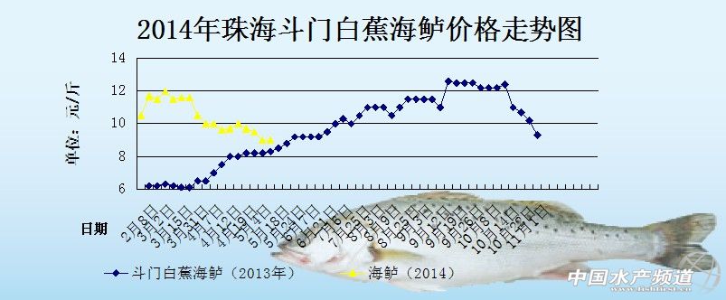 文/中國水產頻道張靜 中國水產頻道原創報道,據悉,本周各地草魚存塘量非常少,草魚苗種和成魚價格皆保持穩定上漲的狀態。本周黃顙魚價格受市場銷售量的影響,價格相比上周出現下滑。具體價格如下: 廣東中山地區草魚:0.1-0.3斤/尾規格魚種價格相比上周上漲0.7-0.8元/斤,0.2-0.5斤/尾規格魚種價格相比上周上漲0.3元/斤,0.3-0.7斤/尾規格魚種價格相比上周上漲0.2元/斤,1.5斤/尾、3斤/尾規格草魚價格相比上周都是上漲0.2-0.3元/斤,5斤/尾規格草魚價格相比上周上漲0.1-0.2元/斤,4斤/尾規格草魚價格跟上周持平。湖南安鄉地區草魚:2-3斤/尾規格草魚相比上周上漲0.2元/斤,3-5斤/尾規格草魚價格相比上周上漲0.1元/斤。其它地區草魚價格跟上周保持穩定,價格無波動。廣東佛山順德地區黃顙魚價格相比上周則下降1.5元/斤,價格波動較大。浙江湖州地區的翹嘴紅鲌價格相比上周上漲0.4-0.6元/斤。 5月14日珠海斗門白蕉地區1.5斤/尾規格的海鱸價格是9元/斤,價格跟上周持平。以下是2014年2月-4月珠海斗門白蕉1.5斤/尾規格海鱸的價格趨勢圖,由圖中可以看出4月份至今海鱸的價格一直處于不斷下降的狀態。 以下是2013年和2014年的珠海斗門地區的海鱸價格對比趨勢圖,圖中可以看出2014年海鱸的價格起步就比2013年的海鱸價格要高4-5元/斤,但是從2014年3月下旬開始出現較大幅度的下滑。 【關鍵字】: 草魚 黃顙魚 海鱸 水產養殖 中國水產頻道獨家報道,轉載請注明出處www.fuqitext.com! |