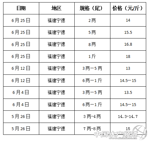 文/中國水產(chǎn)頻道 沈基文 以下是自5月26日截止到今天(6月25日)大黃魚漁排交貨價: 據(jù)業(yè)內(nèi)人士陳先生了解,近段時間恰逢大黃魚排卵,大黃魚排卵后體重減輕,價格會有所增長,但是接下來還會有一個排卵期,在此期間,大黃魚的價格忽上忽下卻在正常漲跌范圍之內(nèi),屬正常情況。 中國水產(chǎn)頻道(www.fuqitext.com)獨家報道,轉(zhuǎn)載請說明出處,違者追究法律責(zé)任, 謝謝合作。 【關(guān)鍵字】:大黃魚 寧德 水產(chǎn)養(yǎng)殖 |