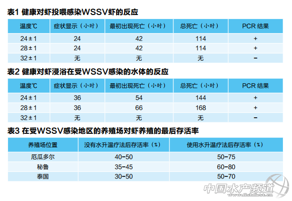翻譯/鐘綺文 中國水產頻道報道,水升溫療法能提高病蝦存活率在研究水溫對南美白對蝦感染白點病(WSSV)的影響時發現,對蝦持續在溫度32±1℃下養殖或在這溫度下養7天后水溫降至28±1℃,感染了白點病的對蝦沒有出現疾病癥狀和死亡。在泰國和拉丁美洲使用水升溫療法后,大大提高了對蝦存活率。 在本文作者的研究中,實驗對象所用的南美白對蝦是從泰國Chantanburi省收集所得,這些蝦通過浸浴和口服途徑來感染WSSV,實驗期間評估水溫和它們產生的相關反應的關系。 能再感染SPF親蝦的病毒被保存在-80℃,接種液是從感染了WSSV對蝦的頭胸甲組織包括鰓和肌肉中獲得。 WSSV的實驗 浸浴處理。在浸浴處理中,180只5g的對蝦轉移到21個90L的含曝氣和加熱的水箱中,然后往水箱中倒入90mL的WSSV接種液。 接種后,其中一組對蝦生活在32±1℃的溫度下,對照組生活在28±1℃的溫度下。其它對蝦生活在32±1℃的溫度下,但分別在1、3、5、7天時,水溫下降至28±1℃。還有一組是空白對照組。每組都有3個重復實驗。 口服處理。在口服途徑中,另外的180只蝦同樣轉移至21個90L含曝氣和加熱的水箱中。首先,給實驗對象投喂按蝦體重10%的患WSSV的病蝦,隨后按蝦體重5%的比例,每天投喂兩次丸狀飼料。 實驗組其中一組對蝦養殖溫度為32±1℃,對照組的養殖溫度為28±1℃。其它實驗組的初次養殖溫度在32±1℃,隨后的1、3、5、7天后,水溫下降至28±1℃。還有一組是空白對照組。每組都有3個重復實驗。 每12小時觀察是否出現疾病癥狀和死亡,直至實驗結束。通過巢式PCR測試和組織病理學來確認對蝦瀕死和存活的狀態。 實驗結果 不管是通過浸浴還是口服途徑感染WSSV的對蝦,持續在32±1℃下生活的和那些感染后在這溫度下生活7天再把溫度降至28±1℃的,都沒有顯示出有WSSV的癥狀和死亡。用巢式PCR和組織病理學來檢測,發現這些存活的蝦對WSSV呈陰性。表1和表2顯示其它實驗組在浸浴和口服感染途徑處理后的42-66小時內觀察到的最初死亡時間。在114-168小時之間觀察的總死亡時間。 能提高存活率 養成池中,即便是使用了溫棚,也不太可能解決水溫問題。但在孵化場育苗期間,利用加熱器,較容易實現水溫保持在32±1℃。但在目前,沒有幾個孵化場的水溫達到這個水平,相比之下,他們的水溫通常在28-30℃,甚至在一些沒有加熱處理器的孵化場,在越冬時期他們的水溫會更低。 雖然在出蝦前會對幼蝦進行WSSV的PCR檢測,但在拉丁美洲和泰國很多養殖場發現,當水溫低于30℃,WSSV就會爆發,當然這只是隨機抽取一些對蝦樣本而不是代表全部對蝦。即便是在有生物安全以及循環水設備的條件下,在初次放苗后的60天,還會出現有因WSSV死亡。一些養殖場經調查決定使用水升溫治療處理7天,其效果顯著,提高了存活率(表3)。 |