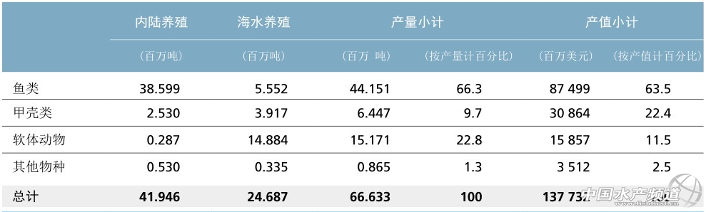 2012年,養殖的甲殼類占食用魚養殖產量的9.7%(640萬噸),但占產值的22.4%(309億美元)。軟體動物產量(1520萬噸)比甲殼類產量多一倍多,但其產值只有甲殼類的一半。事實上,在亞洲,淡水生產的許多軟體動物是淡水珍珠養殖的副產品。其他水生物種就產量而言依然有限(90萬噸),主要在東亞若干國家養殖,市場也在該地區。但某些物種價值較高,如海參。