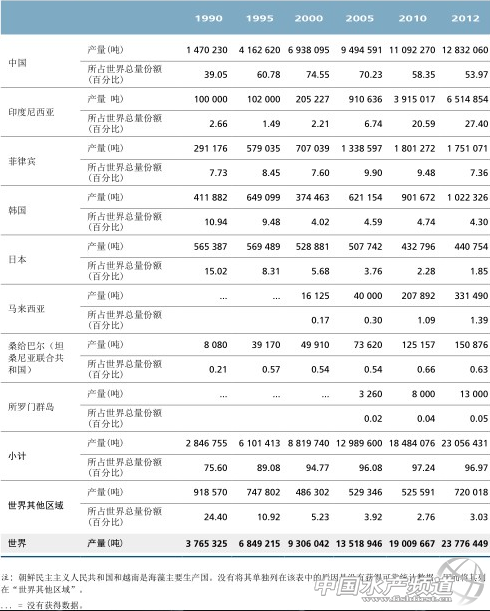 根據現有數據,2012年在世界范圍有33個國家和領地從水產養殖收獲了2380萬噸(濕重)水生植物,而捕撈產量為110萬噸。若干亞洲國家主導著海藻養殖產量(表4),中國和印度尼西亞占總量81.4%。