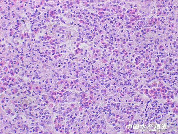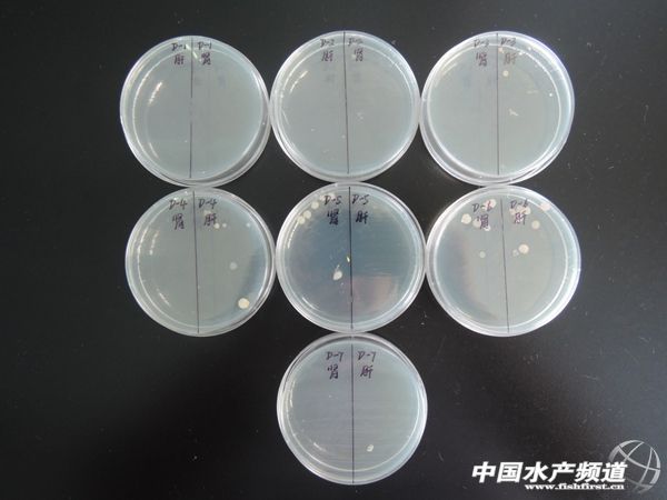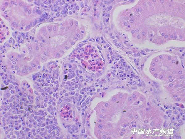 中國水產頻道獨家報道,廣東佛山市倫教鎮一加州鱸魚養殖池塘,面積7畝,水深1.7米,5臺增氧機(見圖1),2014年4月5日,從旁邊塘分塘,分8萬尾大規格的加州鱸魚,小規格的留在原塘養殖。 2014年5月21日左右開始每天有幾十條魚游水、死亡,之后逐漸增多,到5月31日,每天死亡量達到5000尾。其中內服抗菌藥物5天和外用中藥制劑,但是越用藥死亡越多,調水后死亡略有下降。6月2日,死魚6000尾,停料并停止用藥。6月3日-6月6日,每天死亡6000尾。截止6月6日共計死魚5萬多尾。發病魚規格8-10cm。 6月7日,下午3:00到現場測定水溫34℃,用簡易測試盒測水,pH值8.6,氨氮0.2mg/L,亞硝酸鹽0.05mg/L。池塘下風口漂浮著大量死魚(見圖2),塘中有少量魚游水,基本見不到打轉的魚。從塘中取出7尾游水魚,病魚爛鰭、爛身、爛尾,其中一尾魚爛眼,一尾黑身(見圖3)。解剖病魚鰓有少量出血點,肝臟嚴重腫大、充血(見圖4),脾臟腫大,胃腸空虛,腎臟腫大(見圖5)。分別從7尾魚的肝臟、腎臟中接種進行細菌分離培養,并取肝臟、脾臟、腎臟分別用95%酒精及波恩氏液固定做病毒檢測及組織病理切片觀察。另據養殖戶介紹旁邊的母塘養殖的小規格加州鱸魚,因為相同的癥狀已經全部死亡。 圖11:腎臟淤血,腎小管萎縮,腎間組織細胞多壞死