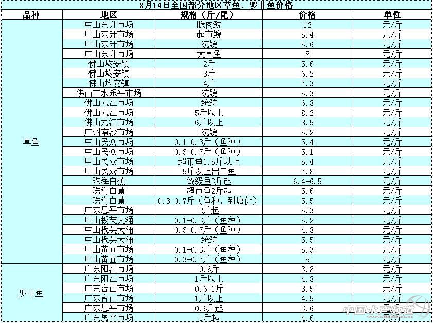 中國水產(chǎn)頻道原創(chuàng)報道,據(jù)業(yè)內人士提供消息,8月14日全國部分地區(qū)草魚、羅非魚價格行情如下: (中國水產(chǎn)頻道水產(chǎn)價格信息共享Q群:245296163,歡迎提供各種水產(chǎn)品一線價格信息!) |