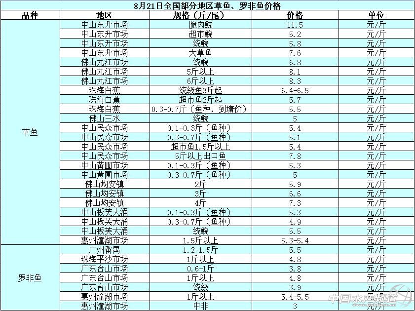 中國水產頻道原創報道,據業內人士提供消息,8月21日全國部分地區草魚、羅非魚價格行情如下: