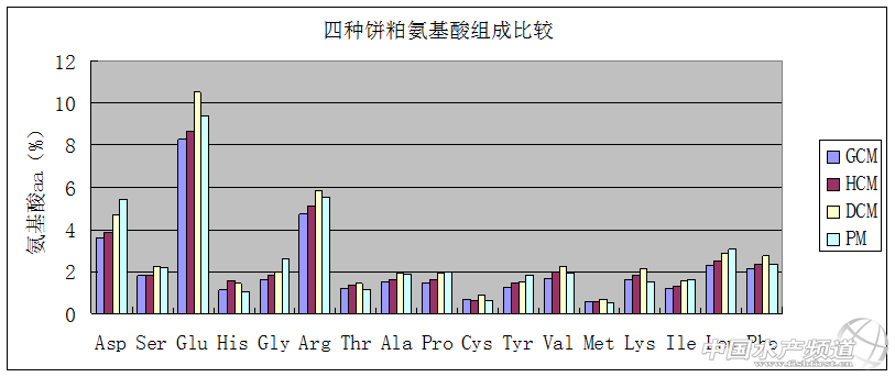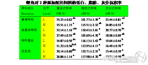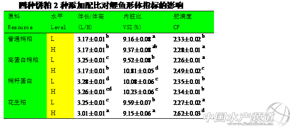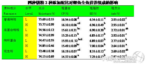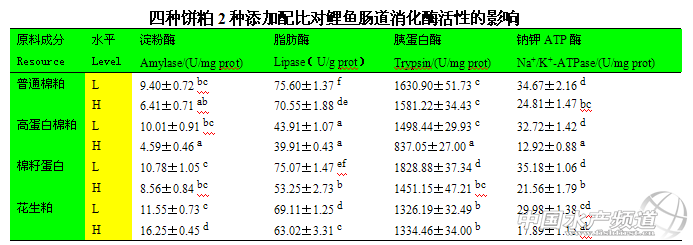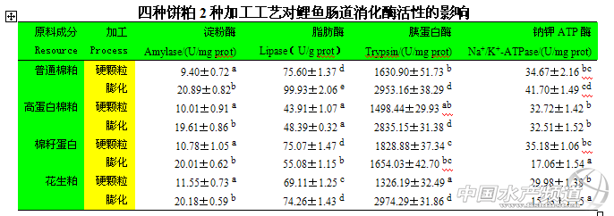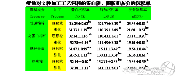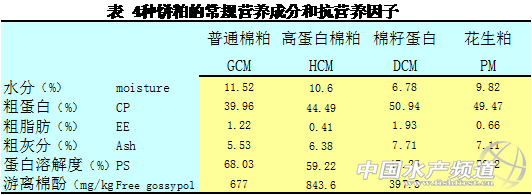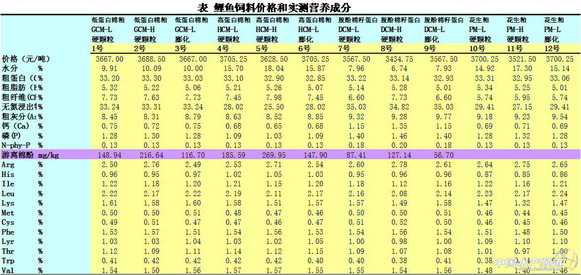 文/新希望六和股份有限公司 羅浩 西南大學動物科技學院 羅莉 一、研究背景 中國水產頻道獨家報道,20世紀70年代起,國內外都開始利用廉價動、植物蛋白原料(如豆粕、菜粕和棉粕)等替代魚飼料中的魚粉,并開展了大量的研究。研究結果表明可以利用植物蛋白原料替代魚飼料中大部分甚至全部的魚粉。棉粕、豆粕、菜粕、花生粕和魚粉是水產動物配合飼料主要的蛋白質原料,它們的用量及相互之間的配合比例決定了配合飼料的蛋白質質量。目前,生產飼料配方的編制更加注重原料的組合,隨著飼料加工技術的趨成熟,膨化飼料也開始在全國推廣開來。鯉魚是我國主要的淡水養殖魚類,也是我國單個種類產量較高的養殖魚類。本試驗是在生產試驗配方條件下,以鯉魚為試驗對象,定量比較普通棉粕、高蛋白棉粕、棉籽蛋白和花生粕4種植物蛋白原料兩種配比,以及硬顆粒與擠壓膨化兩種加工工藝對鯉魚生長、飼料效率、形體、魚體組成、腸道消化酶活力以及肝臟功能的影響,為水產動物營養研究和配合飼料的生產提供參考。 二、研究目標 定量比較普通棉粕、高蛋白棉粕、棉籽蛋白和花生粕對鯉魚生長和生理的影響,探討4種餅粕在鯉魚飼料中膨化前后的差異,和高低配比對鯉魚生長性能和生理機能的影響差異,為飼料中正確選擇和利用4種原料提供科學依據。 三、試驗材料 1、試驗用鯉魚:鯉魚魚種(建鯉),尾重約11克左右。魚種來源于重慶市水產技術推廣站引育種中心。 2、試驗飼料原料:普通棉粕GCM(蛋白含量39.96%)、高蛋白棉粕HCM(蛋白含量44.49%)、棉籽蛋白DM(蛋白含量50.94%)、花生粕PM(蛋白含量49.47%) 原料提供廠家:魚粉、豆粕、棉粕、菜粕、小麥、米糠等原料由重慶希望飼料有限公司提供。 四、試驗分組及設計 選用挑選體格健壯和規格整齊的鯉魚魚種,經1周暫養后,隨機分養于12個處理組(36個養殖水族缸)中,每組分養25尾魚,每組3個平行。4種餅粕在等氮等脂(蛋白33%、脂肪5.0%)條件下分別設計為22%和32%共2個配比,制成硬顆粒飼料;同時低配比(22%)的飼料進行了硬顆粒制粒和擠壓膨化制粒2種加工處理,共配制成12種實用性試驗飼料,在西南大學動物科學國家級試驗示范中心水產養殖系統試驗。(備注:飼料原料的常規營養成分和氨基酸經實測后進行配方設計,配制好的飼料又進行了水分、粗蛋白、粗脂肪、粗灰分的測定。) 五、飼養管理 試驗在西南大學動物科學國家試驗示范中心循環水養殖系統中進行,養殖桶容積0.5m3,放養密度為30尾/箱。每日投料3次,即上午8:30,中午13:00,下午17:30點各投近飽食投喂1次。養殖水族缸配置微孔充氧設施,24小時開啟,以保證魚池中氧氣充足。養殖期間水溫20-28℃,溶氧7-9mg/L。預飼期:2013年6-7月,正式生長實驗期:2013年8月-10月,共56天。 六、研究內容 1、4種餅粕2種配比以及2種加工工藝對鯉魚生長性能的影響。 2、4種餅粕2種配比以及2種加工工藝對鯉魚體營養組成的影響。 3、4種餅粕2種配比以及2種加工工藝的鯉魚飼料養殖鯉魚的的飼料蛋白、飼料脂肪、飼料灰分的沉積效率。 4、4種餅粕2種配比以及2種加工工藝對鯉魚腸道消化酶活性的影響。 5、4種餅粕2種配比以及2種加工工藝對鯉魚肝臟抗氧化機能的影響。 七、測定指標 (一)生長性能指標 1、尾均攝食量(FI):總攝食量/尾數; 2、增重率(WG):100×(終末尾均重-初始尾均重)/初始尾均重; 3、飼料系數((FCR):攝食量/(終末尾均重-初始尾均重); (二)形體指標 1、內臟比:內臟總重/魚體重。 2、肥滿度:體重*100/體長3。 3、體長體高比:體長/體高。 (三)營養組分指標 飼料和全魚水分、粗蛋白、粗脂肪、灰分含量。 (四)飼料中蛋白、脂肪和灰分的沉積率 蛋白質、脂肪或灰分沉積率(%)=100×(終末魚體蛋白質、脂肪或灰分含量×終末魚體重-初始魚體蛋白質、脂肪或灰分含量×初始魚體重)/(飼料蛋白質、脂肪或灰分含量×攝食量) (五)生理生化指標 1、腸道消化吸收能力指標:腸淀粉酶、腸脂肪酶、腸胰蛋白酶、腸鈉鉀ATP酶活性 2、肝臟抗氧化能力指標:超氧物歧化酶(SOD)活性、丙二醛(MDA)含量 八、數據分析 采用SPSS18.0統計軟件對試驗數據進行方差分析和ducan多重比較。 九、項目進度安排 2013年6月-10月試驗準備及試驗進行。2013年10月中旬,完成生長實驗,11、12月完成理化指標分析,12月下旬試驗結果分析及報告總結。 十、研究結果 (一)4種餅粕的常規營養成分、氨基酸、蛋白溶解度和抗營養因子 由上表可知:4種餅粕(普通棉粕GCM,高蛋白棉粕HCM,棉籽蛋白DCM,花生粕PM)的營養組成情況: 1、水分:普通棉粕水分接近12%,含量高于其他三種餅粕。從大到小的順序為:普通棉粕GCM>高蛋白棉粕HCM>花生粕PM>棉籽蛋白DCM。 2、粗蛋白:變化范圍較大,39.96%-50.94%之間。棉籽蛋白DCM的蛋白含量最高,達到50.94%。 3、粗脂肪:棉籽蛋白DCM含量最高(1.93%)、其次普通棉粕GCM(1.22%)、再次為花生粕PM(0.66%)、最低為高蛋白棉粕HCM(0.41%)。 4、粗灰分:棉籽蛋白DCM和花生粕PM粗灰分達7%以上,含量高于普通棉粕GCM(5.53%)和高蛋白棉粕HCM(6.38%)。從小到大的順序為:普通棉粕GCM<高蛋白棉粕HCM<花生粕PM<棉籽蛋白DCM。 5、蛋白溶解度:花生粕PM最高(76.2%)、其次普通棉粕GCM(68.03%)、再次為高蛋白棉粕HCM(59.22%)、棉籽蛋白DCM最低(47.25%)。 6、游離棉酚:高蛋白棉粕HCM最高(843.6mg/kg)、其次普通棉粕GCM(677mg/kg)、最低為棉籽蛋白DCM(397.3mg/kg)。 7、4種餅粕的組