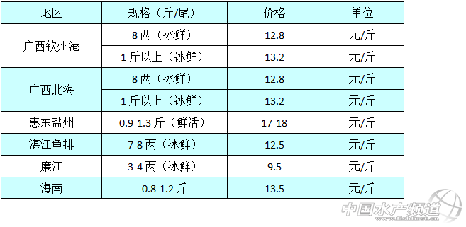 中國水產頻道原創報道,據網友消息,廣西、湛江和惠州惠東和海南地區金鯧魚的價格如下: