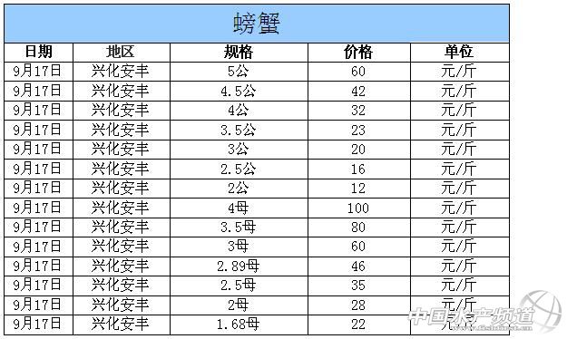 中國水產頻道獨家報道,據網友提供消息,9月17日江蘇興化安豐河蟹價格行情如下: