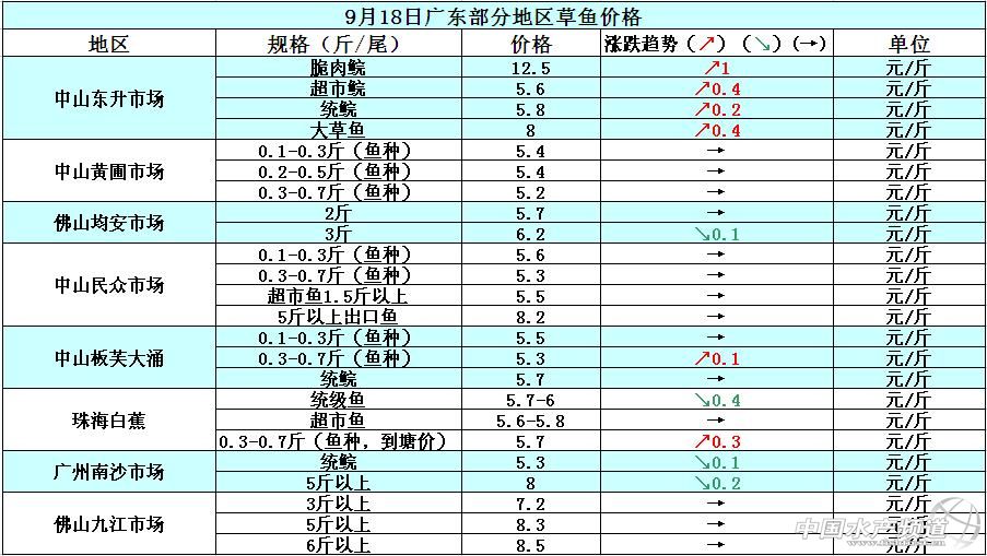 摘要: 9月18日廣東部分地區草魚價格