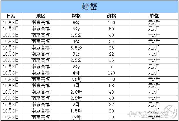 中國水產頻道獨家報道,據網友提供消息,2014年10月8日江蘇高淳河蟹價格行情如下: 南京高淳河蟹價格信息由南京康旭科技有限公司沈先生(電話:13770896772,網站:http://shop110368651.taobao.com)提供,由于價格波動及訂貨量影響,以上價格為收購價格,實際價格請聯系電話。 |