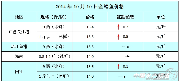 2014年10月10日廣西、湛江、海南金鯧魚碼頭價