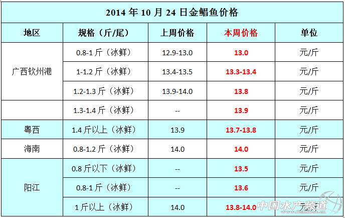 2014年10月24日廣西、湛江、海南、陽江金鯧魚碼頭價