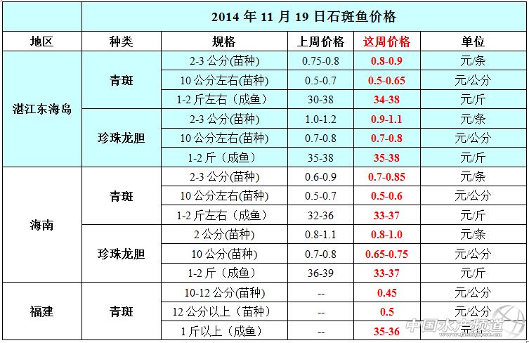 摘要: 本周石斑魚小苗和中苗的價格波動不大,但湛江青斑成魚價格上漲了4元/斤,海南青斑成魚價格上漲了1元/斤,海南珍珠龍膽價格下降了2-3元/斤。