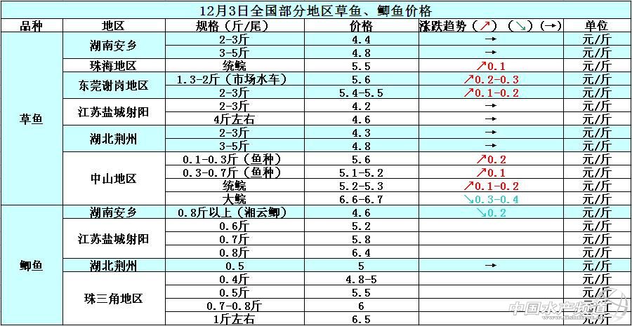 2014年12月3日部分地區草魚、鯽魚塘邊價