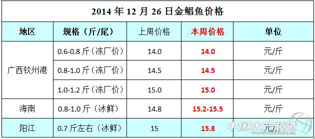 文/中國水產(chǎn)頻道 周雙艷 中國水產(chǎn)頻道獨家報道,據(jù)消息,廣西、海南和陽江地區(qū)金鯧魚的價格如下: 據(jù)了解,廣西欽州港目前冰鮮魚在市面上很少見,凍廠價格基本穩(wěn)定。海南和陽江地區(qū)魚價均有不同程度的上漲,分別上漲了0.4-0.8-7元/斤和0.8元/斤。海南地區(qū)目前冰鮮也不多了,大概10萬斤左右。(以上價格和觀點僅供參考) 【關(guān)鍵字】: 金鯧魚 石斑魚價格 金鯧魚養(yǎng)殖 (中國水產(chǎn)頻道水產(chǎn)價格信息共享Q群:245296163,歡迎提供各種水產(chǎn)品一線價格信息,聯(lián)系QQ:1772358095) |