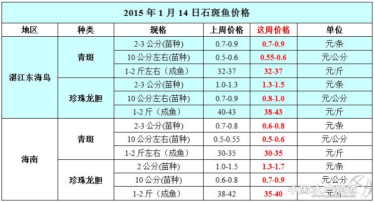 | 文/中國水產頻道 周雙艷 中國水產頻道原創(chuàng)報道,以下是湛江東海島和海南石斑魚魚苗和成魚的價格。 這周石斑魚魚苗價格依然波動不大,湛江2-3公分和10公分青斑苗和成魚價格穩(wěn)定,海南2-3公分的青斑苗降0.1元/條,其它規(guī)格價格穩(wěn)定;湛江2-3公分的珍珠龍膽魚苗上漲了0.2-0.3元/條,10公分的珍珠龍膽苗上漲了0.1元/公分,但海南2-3公分的珍珠龍膽魚苗漲了0.2-0.3元/條,10公分的珍珠龍膽苗上漲了0.1元/公分珍珠龍膽成魚下降了2-3元/斤。(以上價格及觀點僅供參考) 【關鍵字】: 石斑魚 石斑魚價格 石斑魚養(yǎng)殖 (中國水產頻道水產價格信息共享Q群:245296163,歡迎提供各種水產品一線價格信息,聯(lián)系QQ:1772358095) |