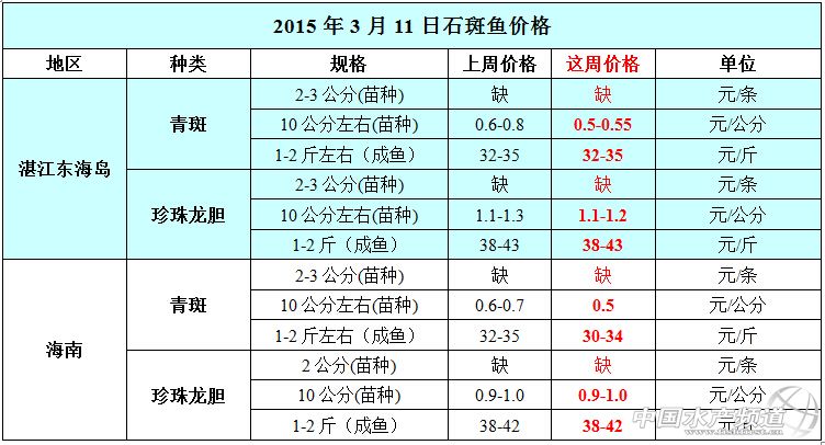 目前湛江和海南石斑魚2-3公分的青斑和珍珠龍膽都比較緊缺,10公分的青斑苗在0.5元/公分左右,湛江10公分的珍珠龍膽1.1-1.2元/公分,海南10公分的珍珠龍膽0.9-1.0元/公分;湛江青斑成品魚32-35元/斤,海南青斑成品魚30-34元/斤,湛江珍珠龍膽成品魚38-43元/斤,海南珍珠龍膽成品魚38-42元/斤。(以上價格及觀點僅供參考)