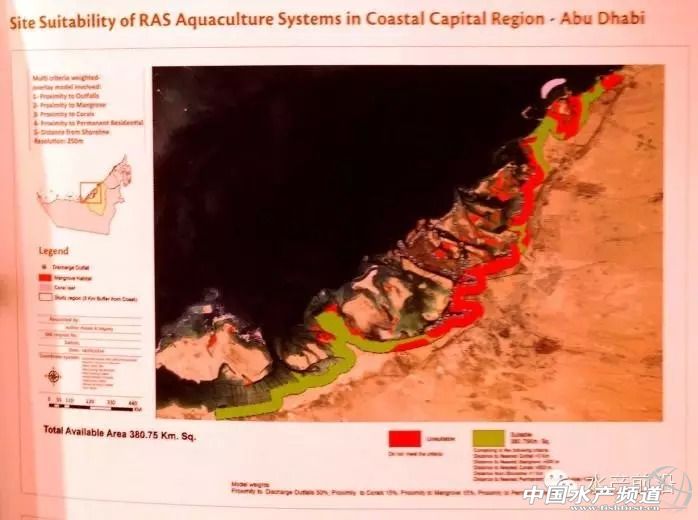 阿聯(lián)酋的AbuDhabi城市海岸線圖,綠色部分標明了可以進行RAS循環(huán)水養(yǎng)殖的海岸區(qū)域。這是政府表明要將循環(huán)水養(yǎng)殖推進的戰(zhàn)略方向。