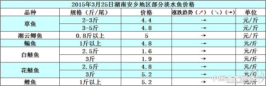 中國水產頻道原創報道,據網友提供消息,下圖就是2015年3月25日湖南安鄉地區部分淡水魚的塘頭價: