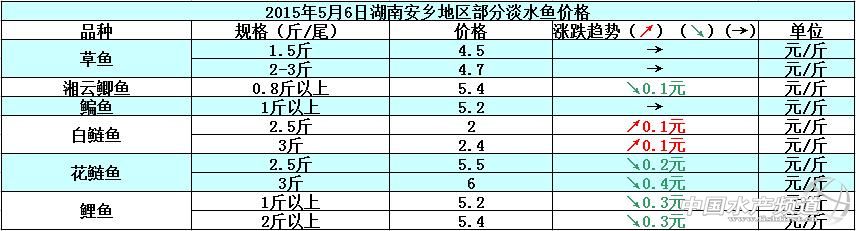 中國水產頻道原創報道,據網友提供消息,下圖就是2015年5月6日湖南安鄉地區部分淡水魚的塘頭價: