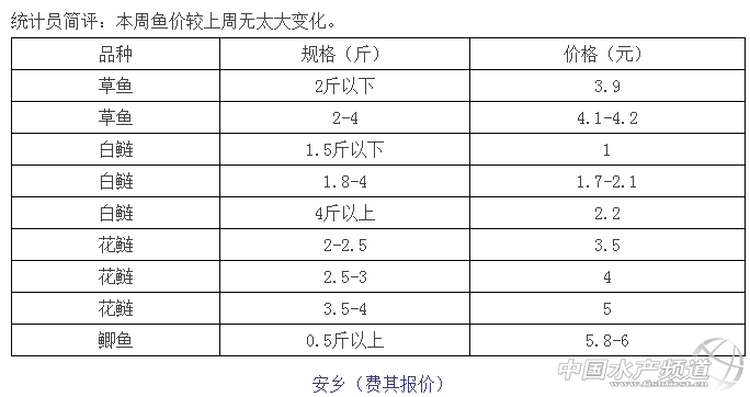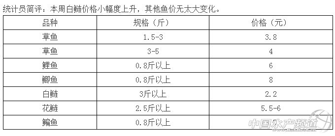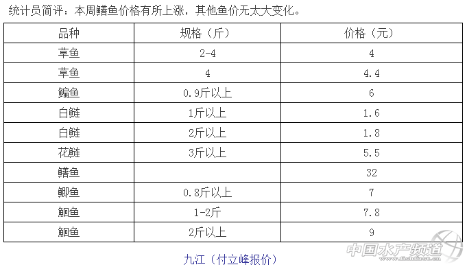 中國水產(chǎn)頻道報(bào)道,據(jù)各個(gè)市場統(tǒng)計(jì)本周魚價(jià)行情與上周統(tǒng)計(jì)日相比,魚價(jià)有所變動(dòng),詳細(xì)報(bào)價(jià)如下: 仙桃(楊柳川報(bào)價(jià)) 【關(guān)鍵字】:華中地區(qū) 塘邊魚價(jià) 水產(chǎn)養(yǎng)殖網(wǎng) |