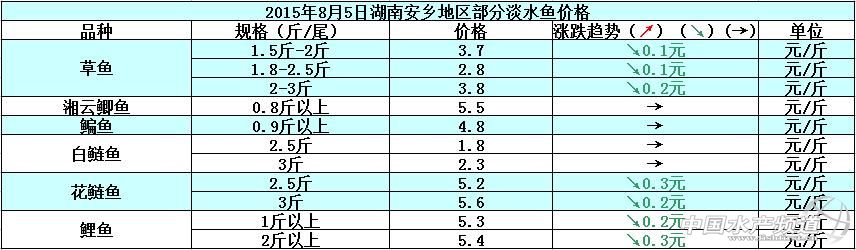 中國水產頻道原創報道,據網友提供消息,下圖就是2015年8月5日湖南安鄉地區部分淡水魚的塘頭價: