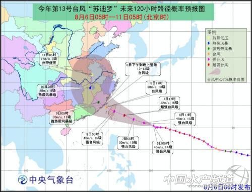 中國水產頻道報道,中央氣象臺8月6日6時發布臺風黃色預警,今年第13號臺風“蘇迪羅”(強臺風級)的中心將于7日夜間到8日早晨在臺灣東部一帶沿海登陸(45-50米/秒,強臺風級);之后穿過臺灣島,將于8日下午到晚上在福建沿海再次登陸(33-38米/秒,臺風級)。