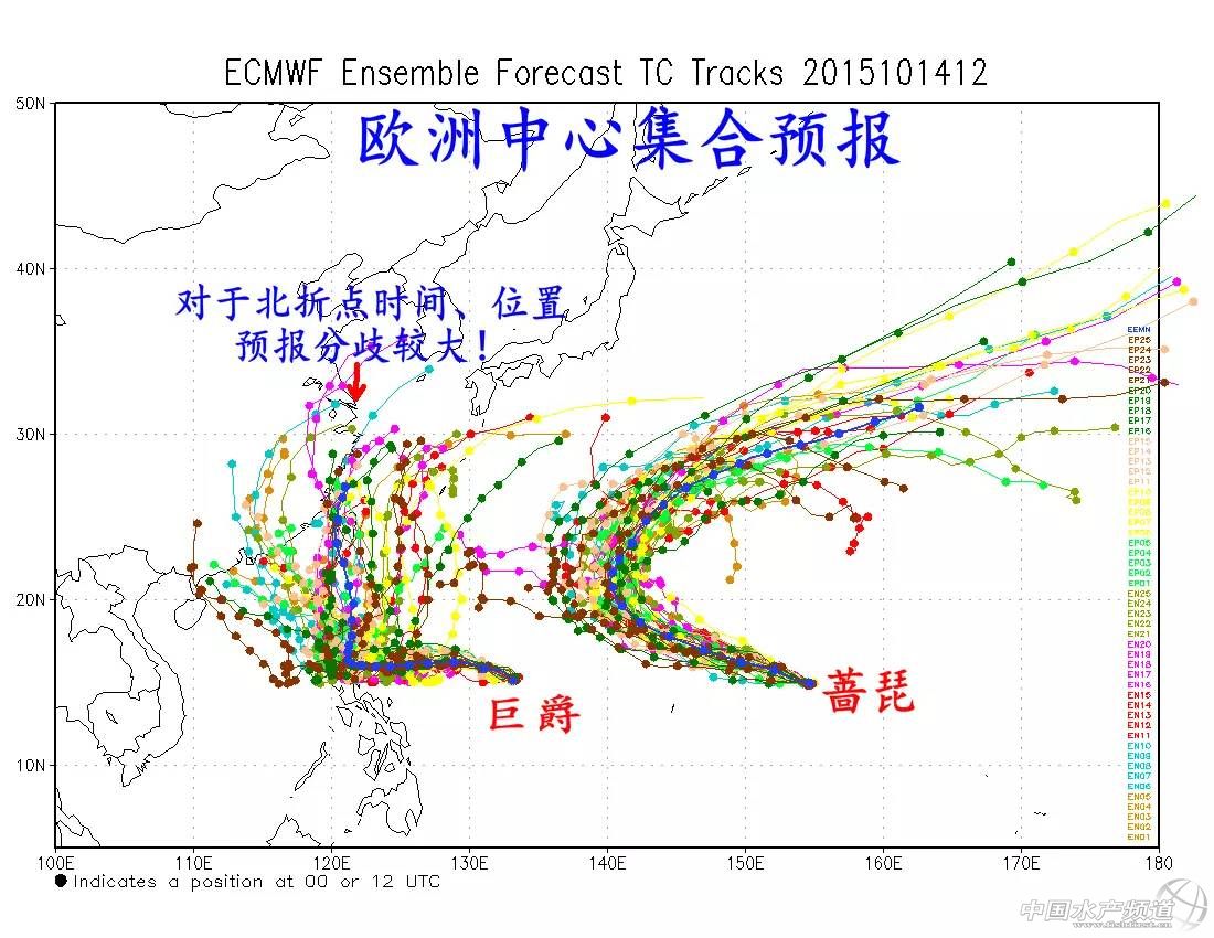 作為業(yè)內(nèi)標(biāo)桿的“歐洲中心”集合路徑預(yù)報,對于“巨爵”北折點(diǎn)的時間、位置分歧非常大,猶如天女散花一般。從平菇菌多年的觀察看,能讓歐洲中心的預(yù)報出現(xiàn)如此不淡定的臺風(fēng),實(shí)屬罕見。