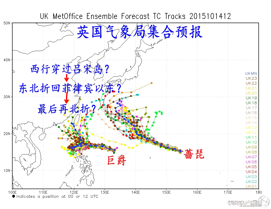 英國氣象局對于“巨爵”的北折報的也非常糾結(jié),他們的意見似乎是“巨爵”先穿過呂宋島,然后再向東北折回巴士海峽以東最后再北上。