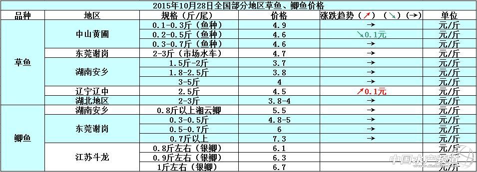 2015年10月28日全國部分地區草魚、鯽魚塘邊價