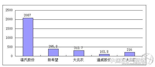 文/圖 水產前沿 唐東東整理 中國水產頻道報道,11月2日,國內最大的畜牧企業溫氏集團由深圳證券交易所正式登陸資本市場,證券簡稱為“溫氏股份”,當日總市值達2087億元,躍升為國內農牧行業市值最大的上市企業,也是唯一的千億級別的農牧上市企業。 圖1 主要的農牧上市企業總市值對比(億元)