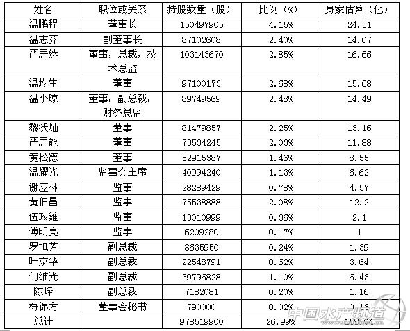總計而言,溫氏股份上市后共造就了約48位身家財富過億者。 表1 董事、監事、高級管理人員持股情況 表2 公司前十名股東持股情況 表3 溫氏股份45位發起人的身家情況(億) 【關鍵字】:溫氏股份,上市,48,深交所第一股,水產網 |